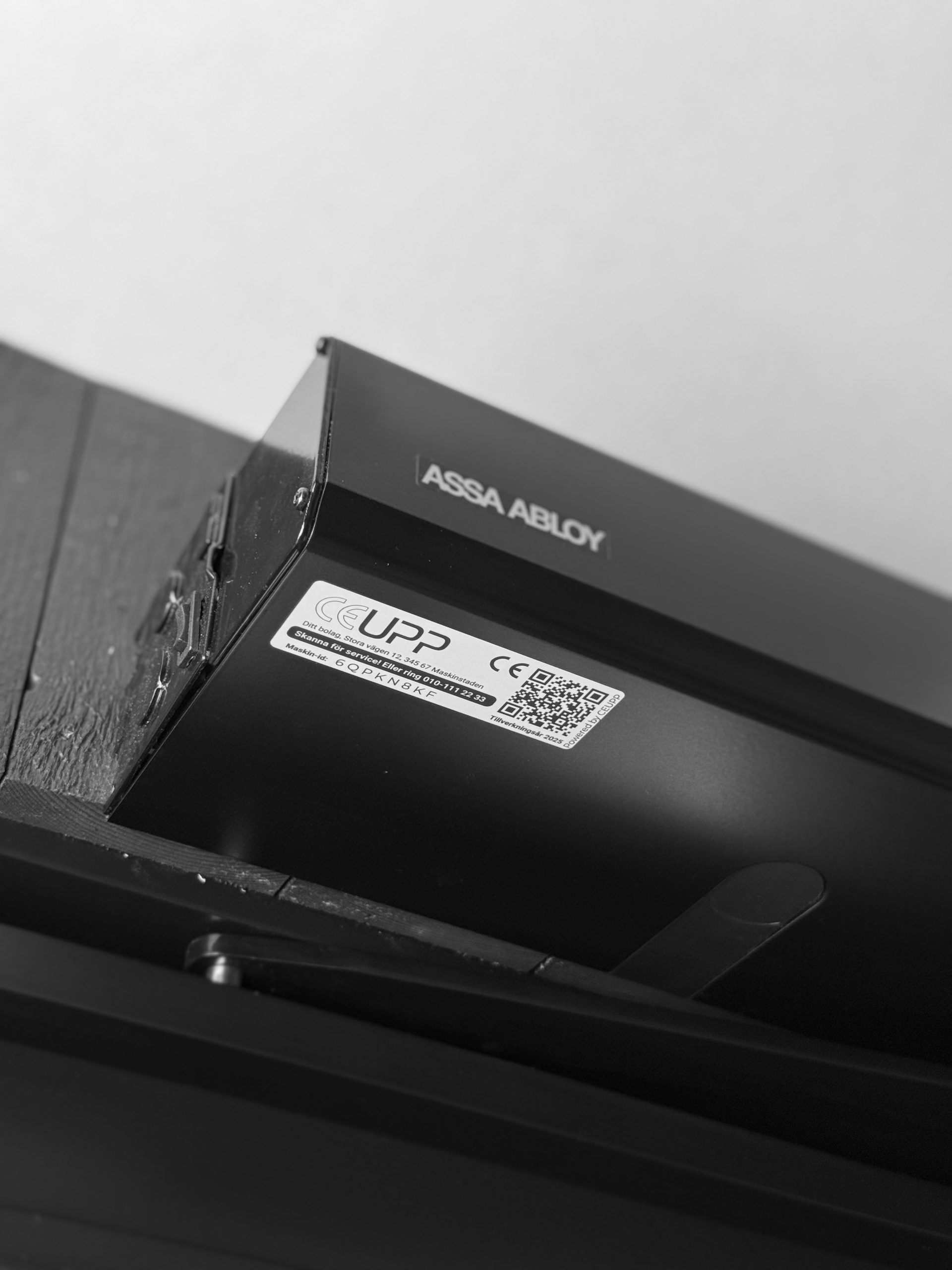 Vid CE-märkningen lägger teknikern upp fastighetsbeteckningen och tilldelar varje dörrautomatik en unik QR-kod. QR-koden skannas för att aktiveras och kopplas till fastighetsbeteckningen. Grunddata om dörren anges i ett formulär, och dörrens funktion dokumenteras med foto och video. Teknikern guidas sedan genom riskanalys och egenkontroll.